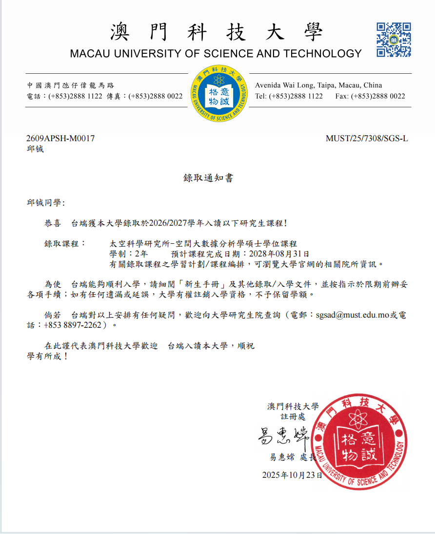 确定目标后,邱铖迅速进入“冲刺模式”。他系统梳理了个人经历,将竞赛获奖证书、科研参与证明分类整理,形成逻辑清晰的申请材料;针对中英双语面试,他更是下足功夫:不仅反复复盘本科知识体系,还深入思考如何将本科的学科背景与空间科学的前沿问题相结合,提前梳理面试思路。最终,凭借明确的个人规划和扎实的综合素养,邱铖顺利通过面试,成功拿到澳门科技大学的录取通知书。