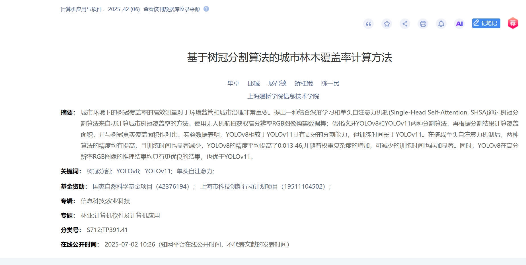 凭借竞赛中展现的专业功底与主动钻研的态度,邱铖成功加入毕老师的“单木树冠的智能识别与分割算法”课题组,正式叩开科研大门。刚进组时,他从最基础的文献检索做起,泡在学术平台和数据库里梳理领域综述,摸清研究方向;研读他人论文时,不仅学算法创新点,还专门记录行文逻辑,慢慢搭建自己的学术思路。遇到技术漏洞,他会先反复排查,再带着问题向导师请教,根据建议一次次调整方案。经过多轮修改打磨,他以第二作者的身份将研究成果撰写成论文《基于树冠分割算法的城市林木覆盖率计算方法》,成功发表在北大核心《计算机应用与软件》期刊上。这段科研经历,让他不仅掌握了从选题到论文投稿的全流程,更练出了扎实的数据处理与算法能力——而这些积累,恰好与澳门科技大学“空间大数据分析”专业的核心课程要求高度匹配,为他后续的硕士申请埋下了关键伏笔。