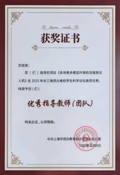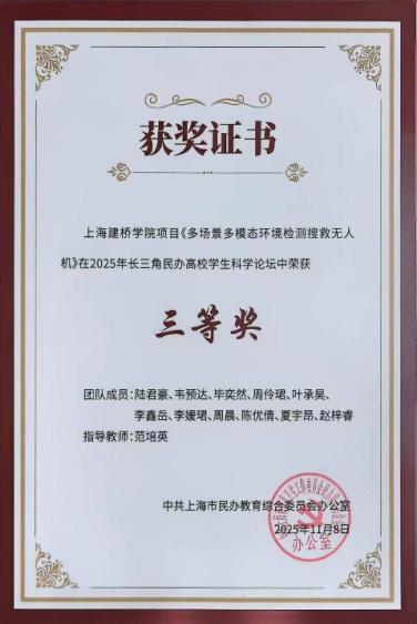 本次论坛严格遵循 “公平、公正、公开” 原则,经过校内外行业专家多轮评审与专业指导,由范培英老师指导申报的 “多场景多模态环境检测搜救无人机” 项目脱颖而出,荣获三等奖。由蒋中云、范培英老师指导申报的“禾籁智翼—AI+声频动态调控农业无人机系统”荣获优胜奖。