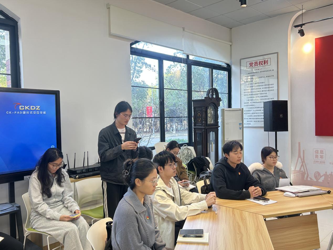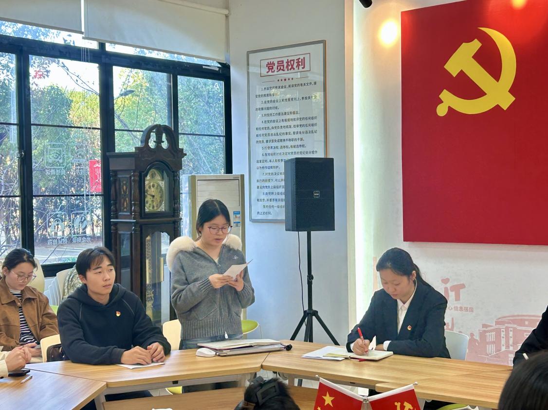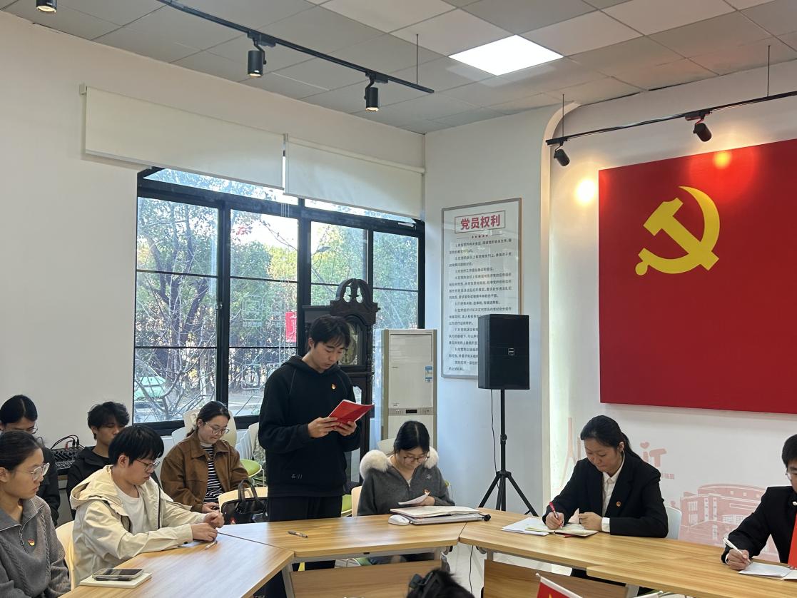 党支部组织委员张灿灿同志围绕《中国共产党章程》进行系统导读,重点阐释党章的根本地位、党员义务与权利、党的组织制度、宗旨目标以及纪律规矩等内容。她提出三点要求:一要持续深入学习党章,掌握核心要义;二要自觉以党章为镜鉴,规范自身言行;三要立足学生本职,践行党章要求,推动学习成果转化为实际行动。