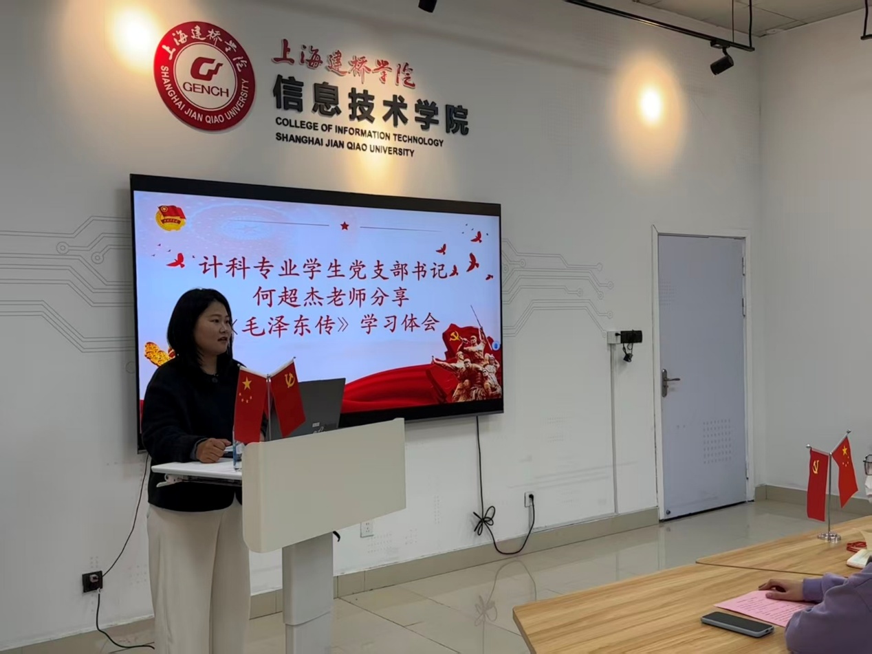 为深入学习贯彻习近平新时代中国特色社会主义思想,扎实推进党史学习教育常态化长效化,信息技术学院党建服务中心持续打造“溯光·”系列理论学习品牌,坚持制度化、月度化的学习机制,引导青年学生在学思践悟中坚定理想信念、汲取历史智慧、砥砺政治品格。11月20日,信息技术学院在党建服务中心举办“溯光·《毛泽东传》”十一月读书会。计科专业学生党支部书记何超杰老师、学院党建中心学生代表参与本次活动,共同研读这部记录伟人光辉历程与思想发展的经典著作。本次读书会由学习研讨部汤伊轲同学主持。
