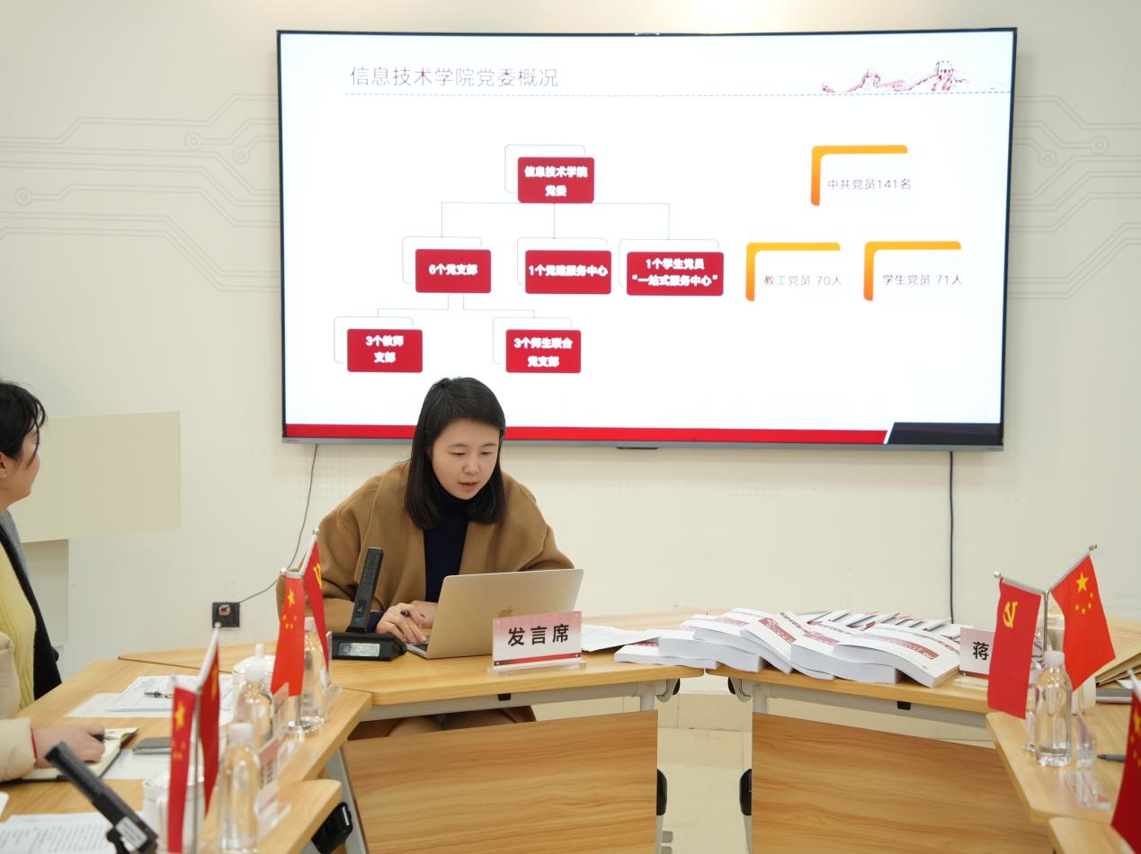 为深入贯彻新时代党的建设总要求,全面提升基层党建工作水平,12月10日,学校机关总支书记、组织部副部长潘明芸率巡查组一行莅临信息技术学院,在党建服务中心开展2025年基层党建专项巡查工作。巡查组由马克思主义学院党总支书记胡家俊、纪委办公室副主任朱燕莉、职业技术学院党委书记党松杰、二级党组织专职组织员刘沛雨、廖艺晗组成。信息技术学院党委书记杜鹃、副书记徐娜、专职组织员郭天慧及党委委员、各党支部书记参加会议,会议由杜鹃主持。