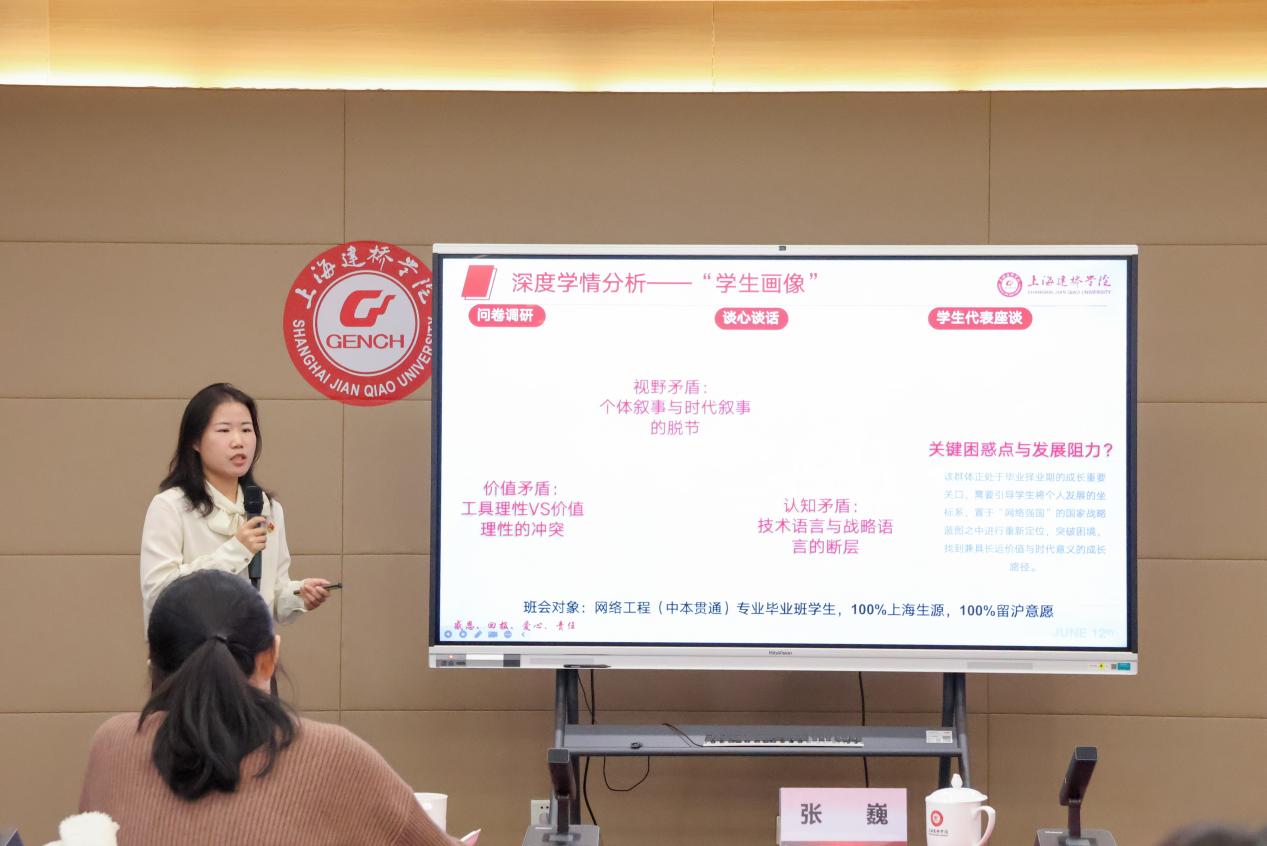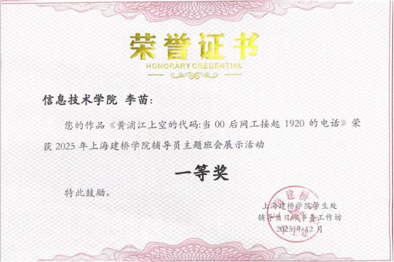 12月11日,上海建桥学院2025年主题班会展示活动圆满举行。本次活动由学生处牵头组织,经前期层层选拔,来自全校的7位优秀辅导员同台竞技,围绕主题班会设计与实施展开精彩比拼。比赛分为命题说课与现场展示两大环节,全面考察辅导员的育人理念、教学设计能力与临场应变水平。我院辅导员李苗老师凭借精巧的班会设计、生动的现场演绎以及深厚的育人积淀,凭借《黄浦江上空的代码:当00后网工接起1920的电话》主题班会,在激烈角逐中脱颖而出,荣获一等奖!